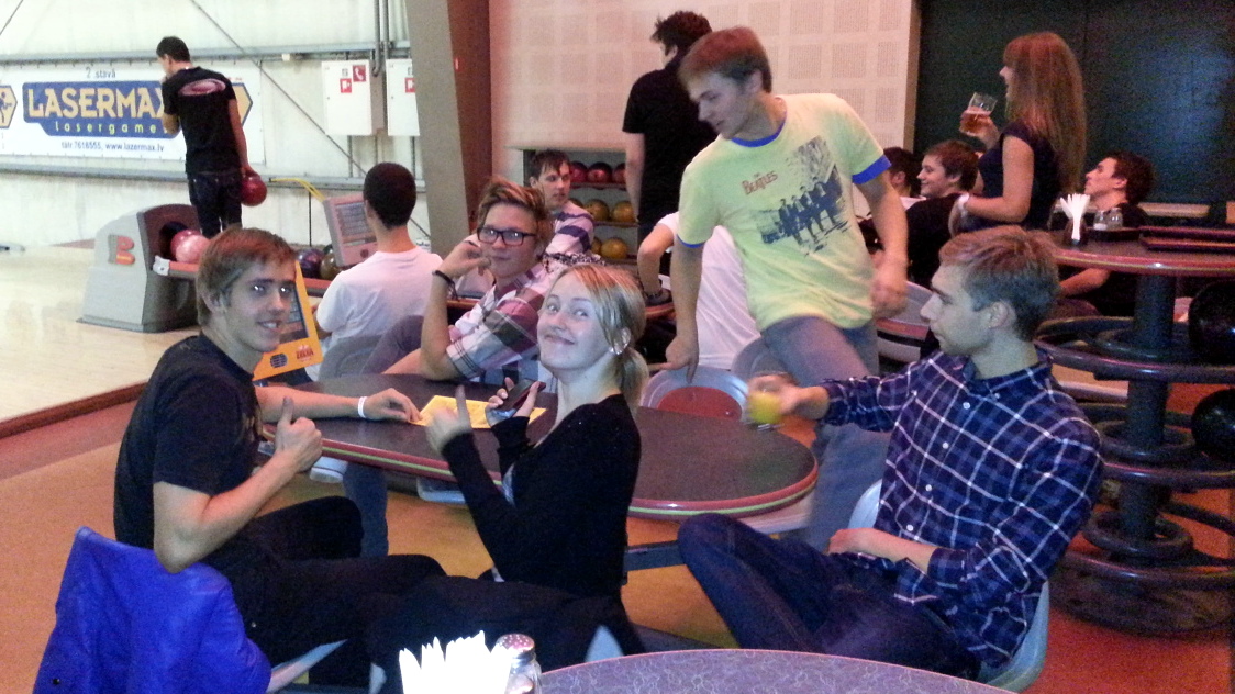 Trešdienas vakarā, 09.10.13, datoriķi un viens mediķis devās iemēģināt savu roku boulingā, šoreiz, tāpat kā iepriekšējās reizēs, devāmies uz Zelta Boulingu, Uzvaras bulvārī 4/2. Šis bija pirmais boulinga pasākums šajā mācību gadā, kurā bija ieradušies tiešām daudz cilvēki, kopā bijām 27 spēlētāji no visiem 4 bakalaura kursiem. Sadalījāmies pa 5 celiņiem, no kuriem viens bija Edžu celiņš - visi seši spēlētāji tiešām ir Edgari. Boulingā aizvadījām 2 jautras un aizraujošas stundas, cilvēkos radās neliela konkurence, kurš iegūs augstāko punktu skaitu vai tieši pretēji smieklīgāko punktu izkārtojumu. Bumbu ripināšanas taktika katram bija izstrādāta sava - tika gan spēcīgi ripinātas un mestas uz priekšu, gan ar griezienu, gan viegli pamestas, gan arī iegrieztas pretēji ripošanas virzienam. Pēc šīm divām stundām, 6 cilvēki izlēma turpināt bumbot un izmēģināja spēkus biljardā, tika spēlēts dažādās komandās pret dažādiem pretiniekiem, pielietota gan ģeometrija un leņķu mērīšana, gan tīri vienkārša veiksme un cerība trāpīt pa bumbiņām. Lielāko prieku spēlētājiem sagādāja pretinieki, kuri nejaušu iemeslu dēļ kabatās trāpīja ne savas bumbiņas. Noteikti dosimies vēl, tāpēc, ja kādu iemeslu dēļ šoreiz nesanāca atnākt, tad droši pievienojies mums nākamreiz!