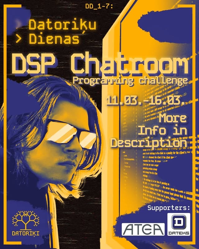 Esam izveidojuši īpašu datoriķu tērzētavu, kurai jāpievienojas ar Datoriķu Saziņas protokolu (DSP). Tātad, nepietiks vien ar saites atvēršanu, būs jāuztaisa programma, kas varēs pievienoties serverim. Vai būsi spējīgs atkost DSP? 😎🤔