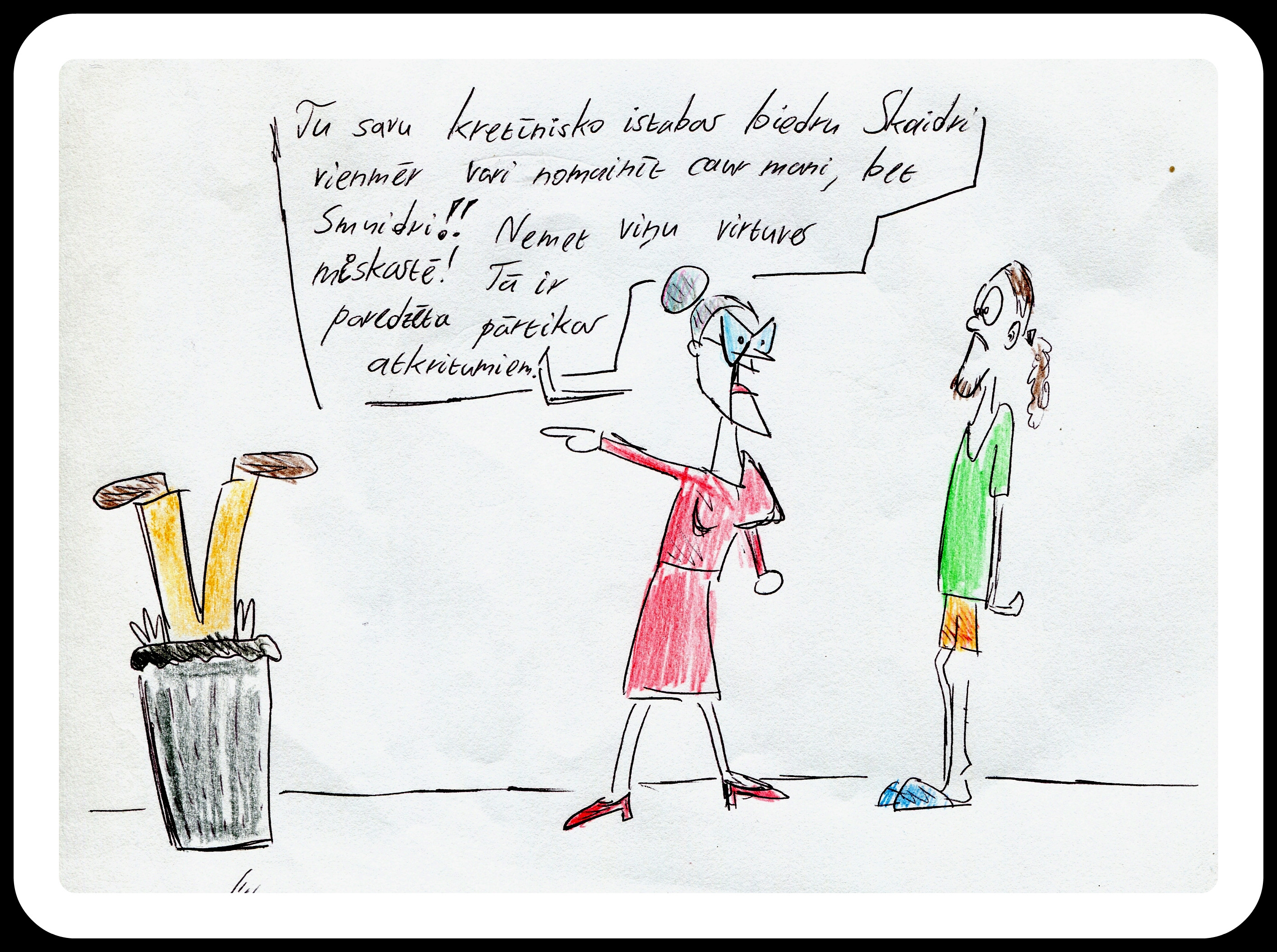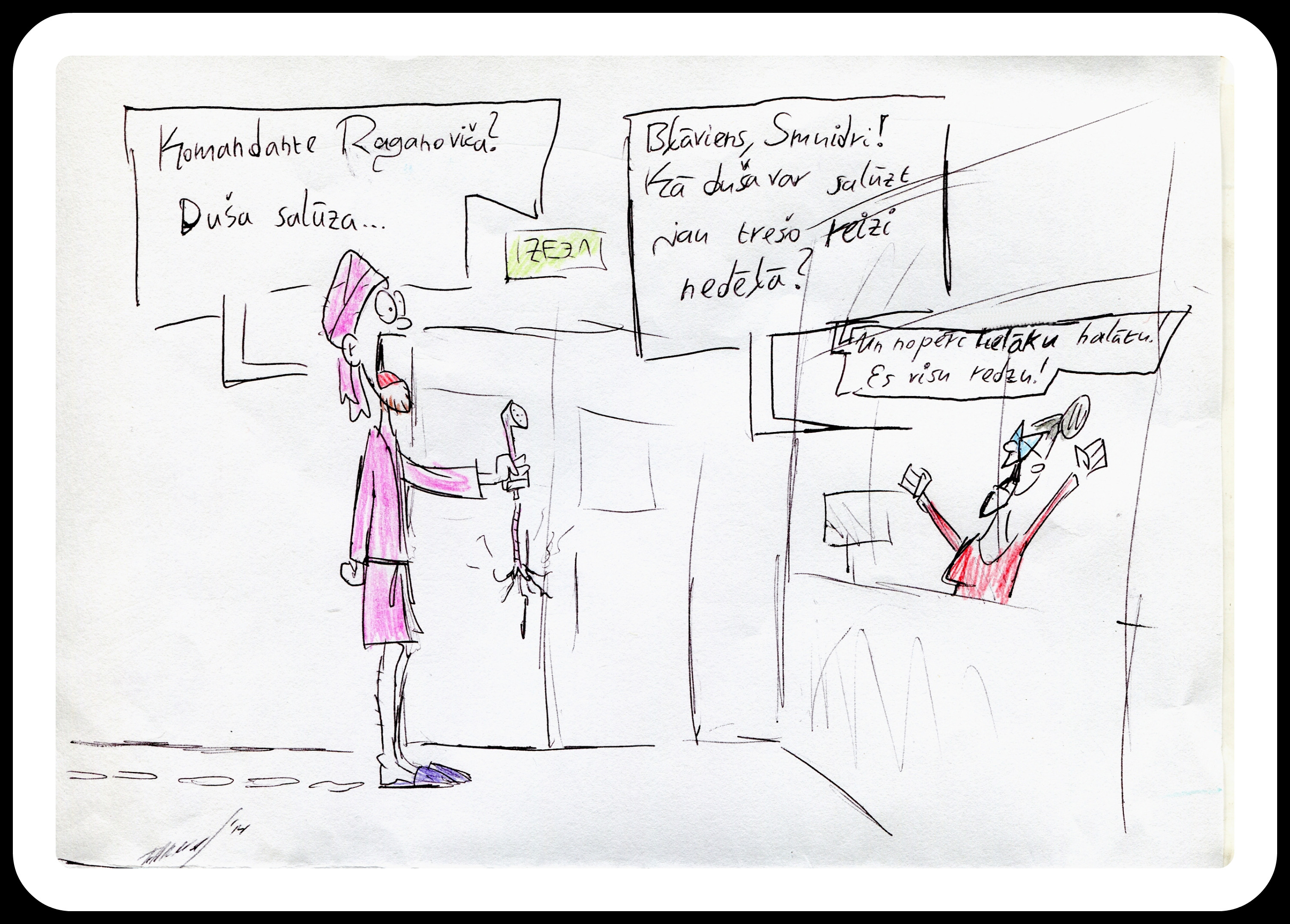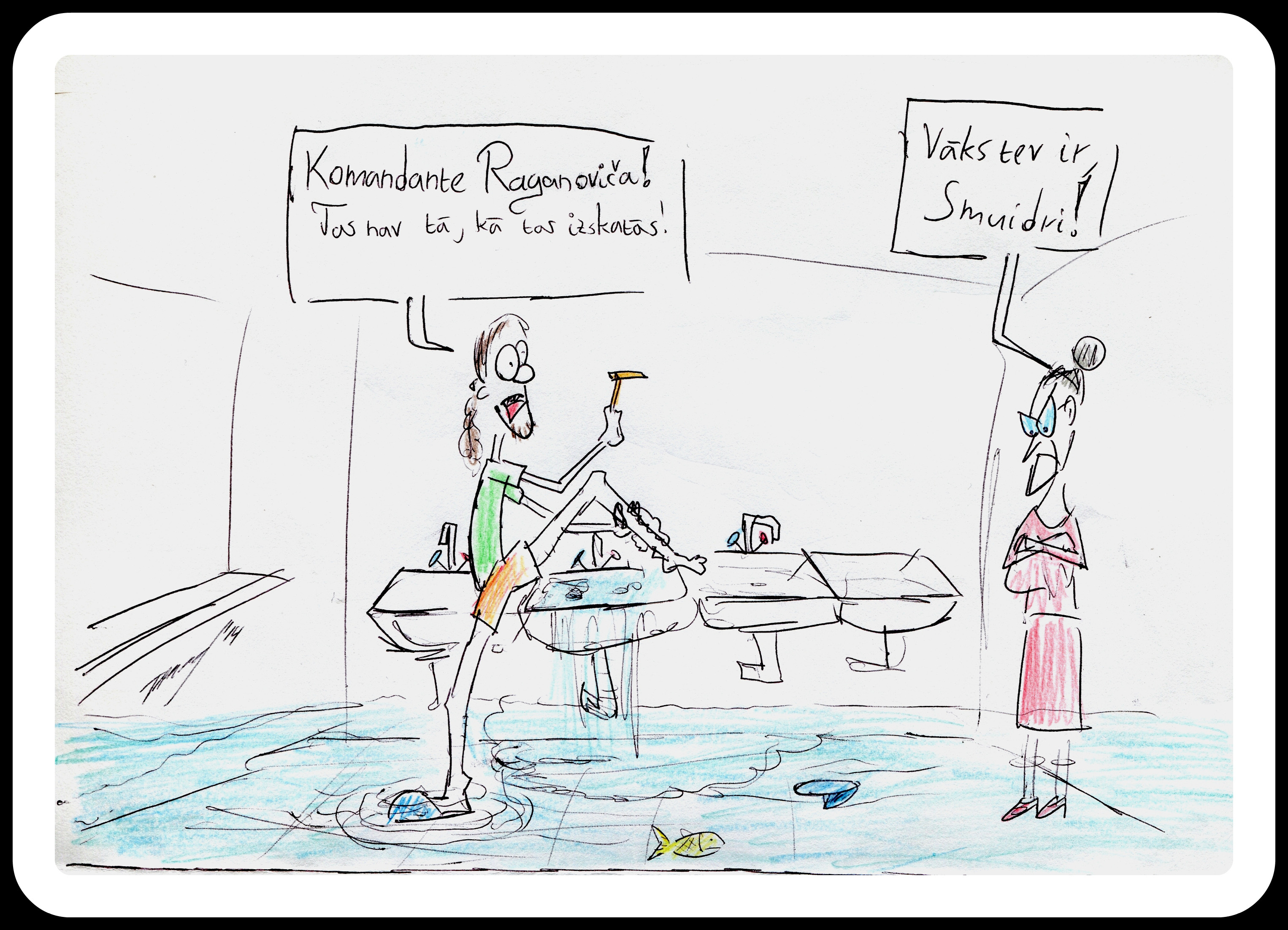 Humoristiskajos zīmējumos atainotas divas personas - students Smuidris un komandante Raganoviča.